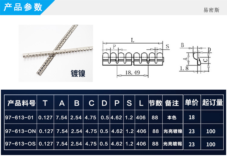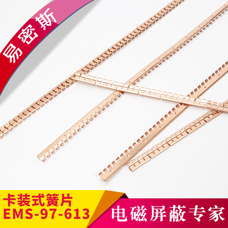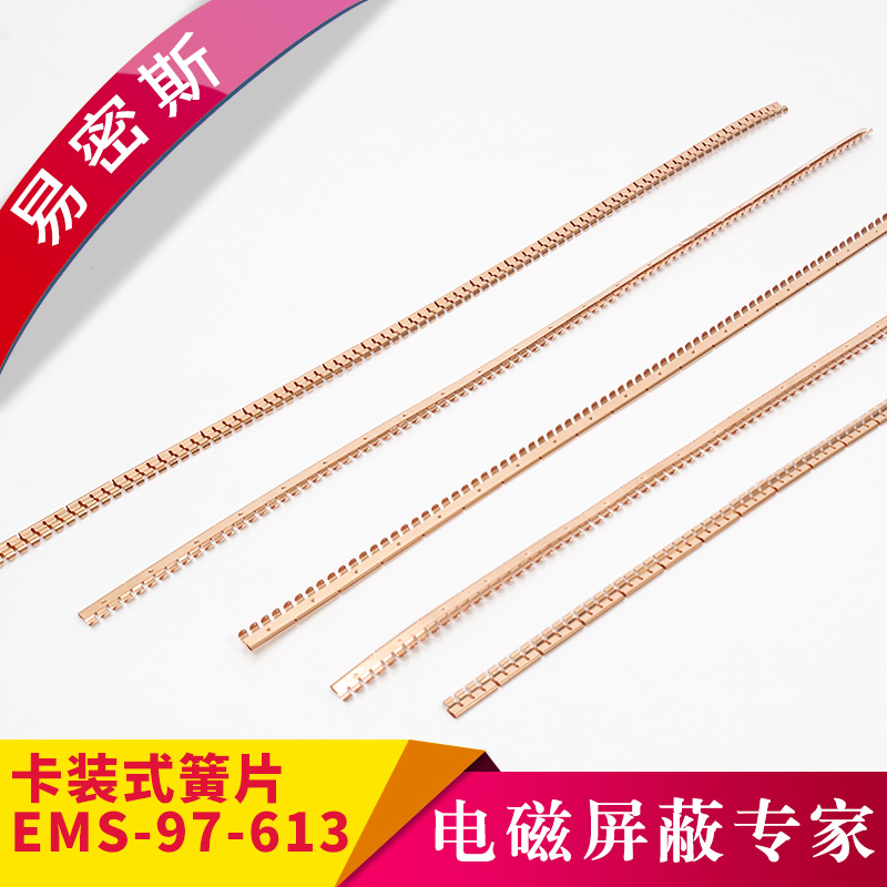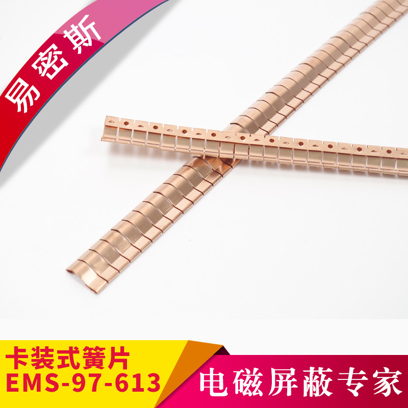 易密斯™鈹銅簧片由具有電磁兼容屏蔽效果的進(jìn)口鈹銅合金C17200制成,具有優(yōu)秀的抗壓性、回彈性和耐腐蝕性,并提供很好的寬頻電磁屏蔽效果,特別適用于通訊機(jī)柜、電腦、屏蔽室/門、面板及插拔件的間隙填充。易密斯™鈹銅簧片現(xiàn)有60余款標(biāo)準(zhǔn)件可供選擇,同時(shí)可支持定制。
